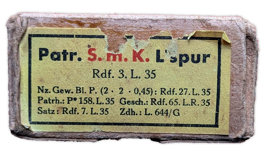| Rdf. 27. L. 35 Rheinisch-Dynamit-Fabrik, Röhrdorf 27. Lieferung 1935 Poudre produite par la Rheinisch Dynamit-Fabrik, Röhrdorf, 27ᵉ lot, année 1935. | Patrh.: P*158.L.35 Patrh. = Patronenhülse l’étui de la cartouche. P*158 = code du fabricant de l’étui correspond à Metallwarenfabrik Treuenbrietzen GmbH, Werk Sebaldushof (vorm. Sellier & Bellot) L.35 Lieferung 35 Lot année 1935. Etui fabriquée par Metallwarenfabrik Treuenbrietzen GmbH (ex-Sellier & Bellot), lot 35, année 1935. | Gesch.: Rdf. 65. L.R. 35 Gesch. Geschoss la balle Rdf. Rheinisch-Dynamit-Fabrik, Röhrdorf. 65. L.R. 35 65ᵉ lot, R. peut signifier Röhrdorf-Werk Rottweil (usine satellite). Projectile (balle) fabriqué par Rheinisch-Dynamit-Fabrik (Röhrdorf / Rottweil), 65ᵉ lot, 1935. |