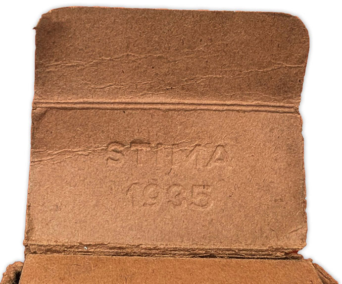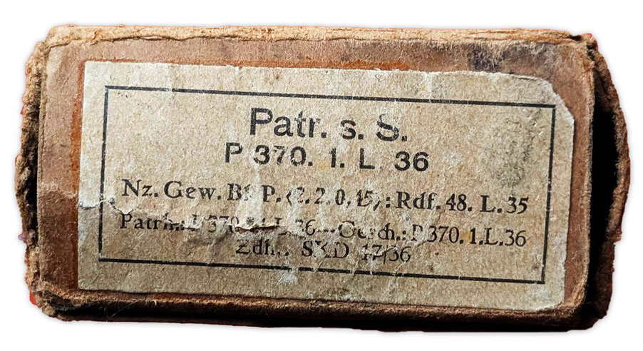 | Patr. s. S. Patronen schweres Spitzgeschoss Cartouches pointue à balle lourde | P 370. 1. L. 36 P 370. code fabricant ou de l’atelier 1. Lieferung 1936 1er Lot de 1936 | Rdf. Rheinisch-Dynamit-Fabrik, Röhrdorf Usine du groupe Dynamit AG (membre de l’empire IG Farben, producteur d’explosifs et de poudres). 48 Lieferung Lot 1935 |