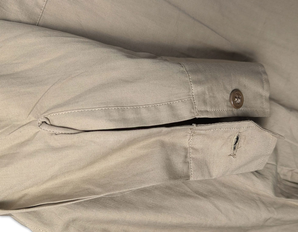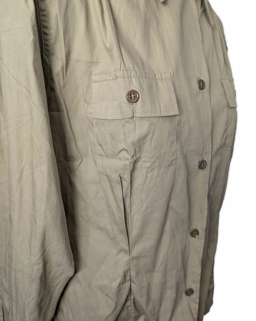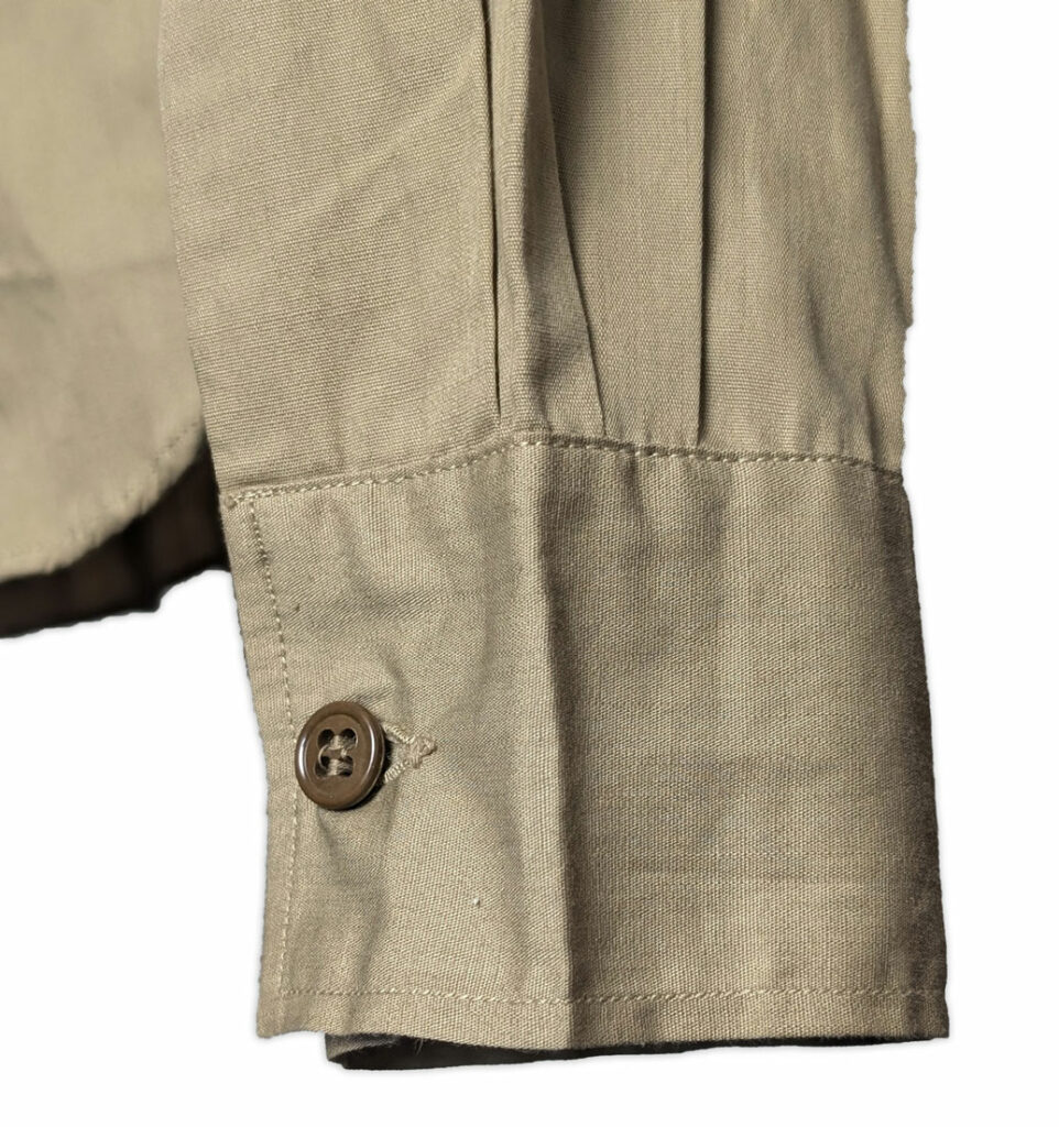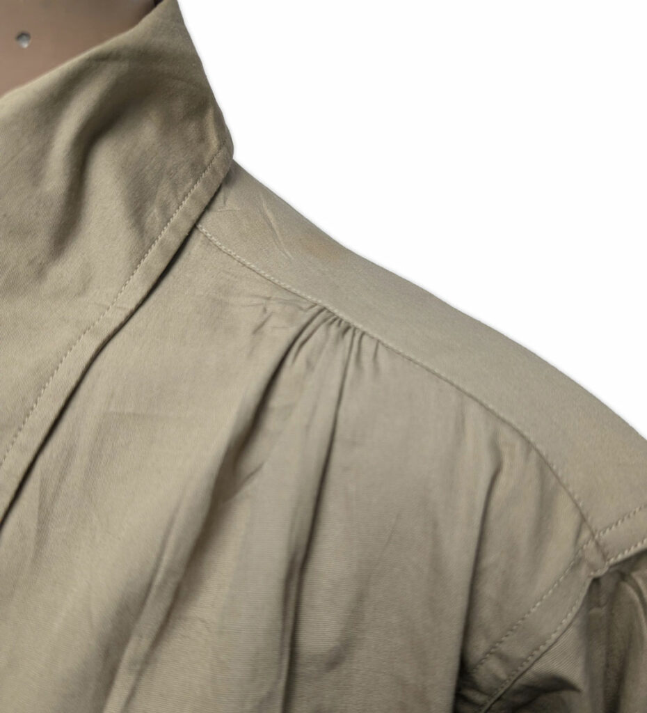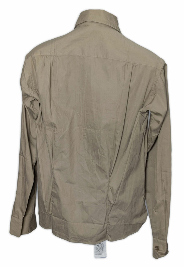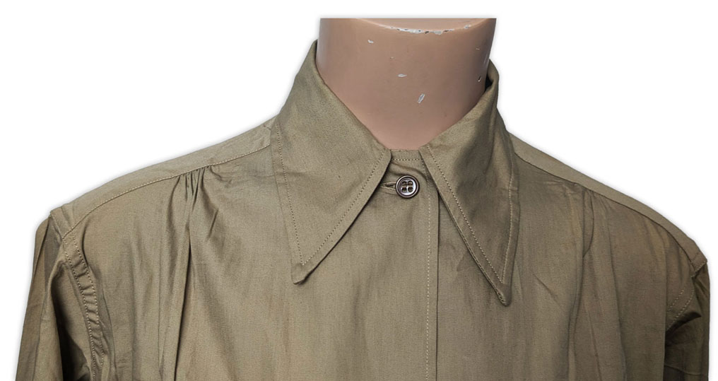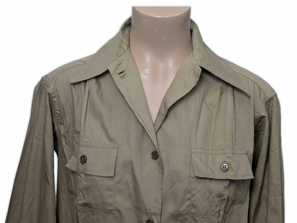 Le chemisier était doté d’un col convertible, pouvant être porté ouvert afin d’améliorer le confort lors des activités sur le terrain ; dans cette position, le col restait bien à plat.