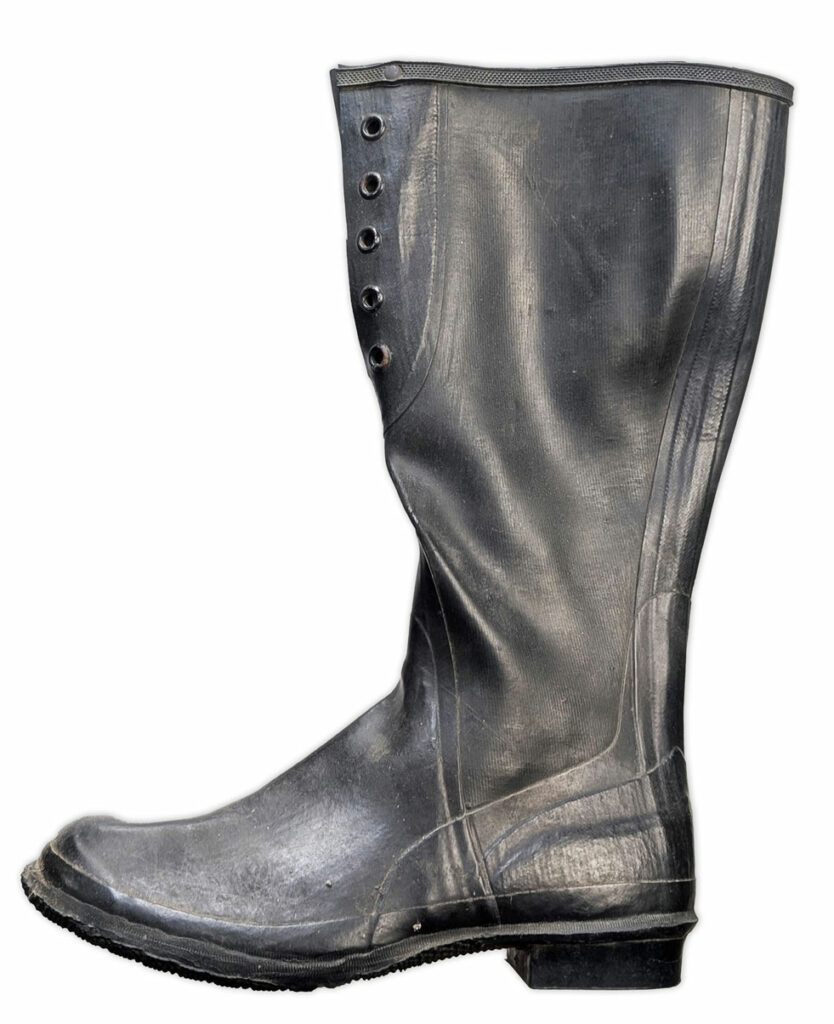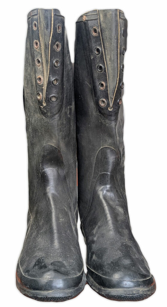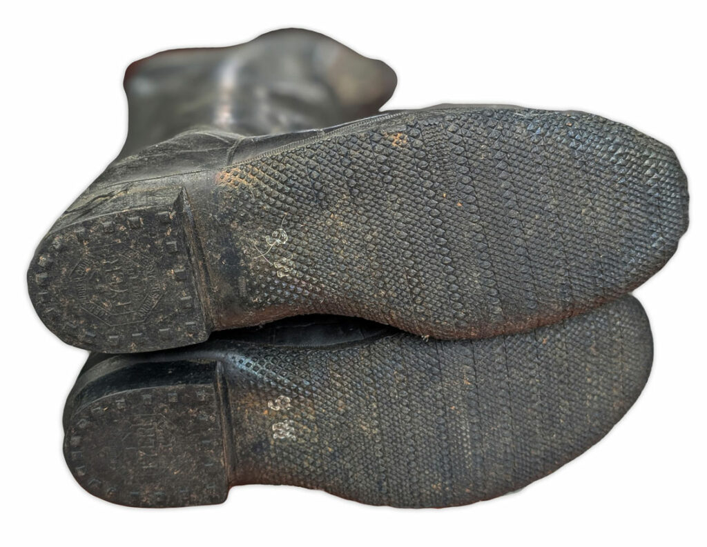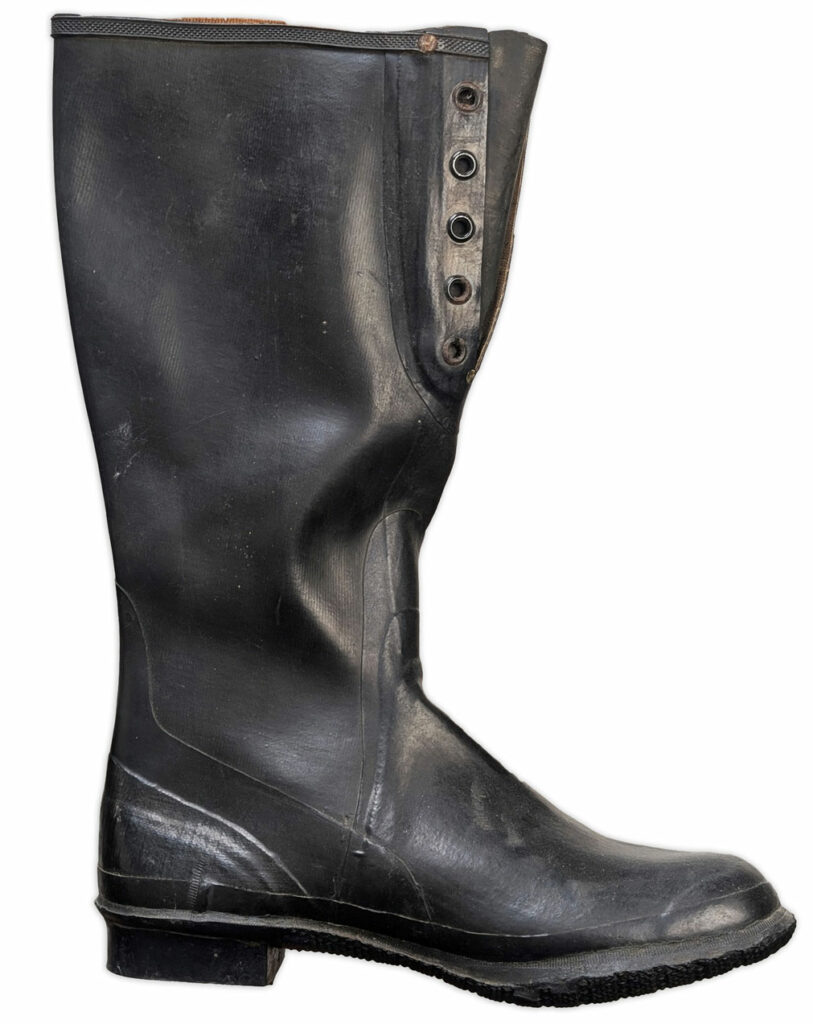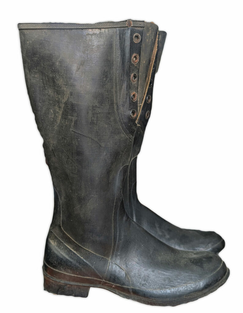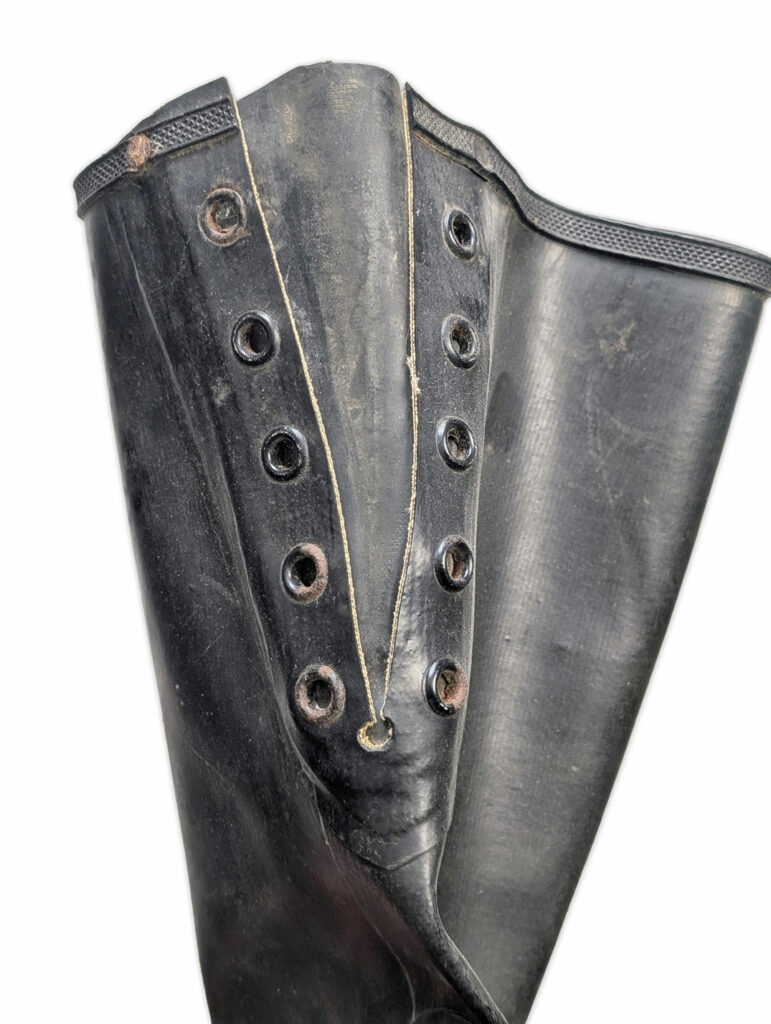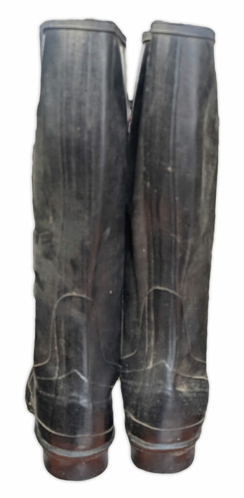 Ces bottes en caoutchouc, modèle M-1937, étaient conçues pour protéger les soldats des environnements humides et boueux. Leur hauteur jusqu’au genou permettait de traverser des zones inondées ou marécageuses . Portées avec des chaussettes en laine, elles constituaient une protection efficace contre l’eau et le froid ponctuel.