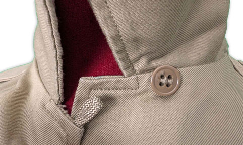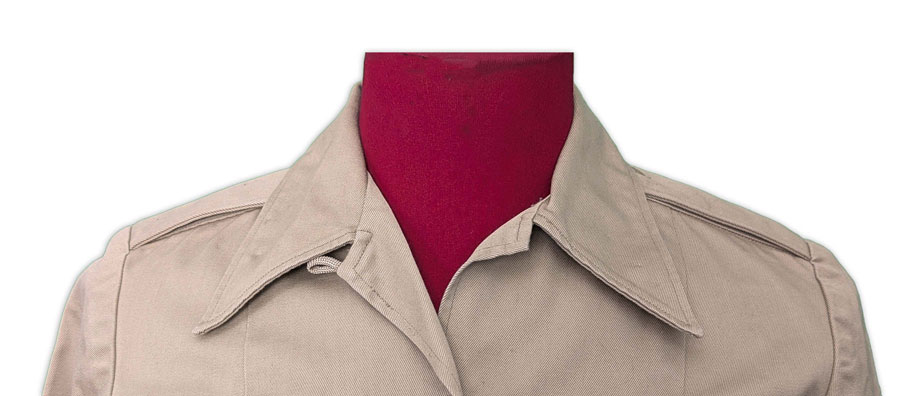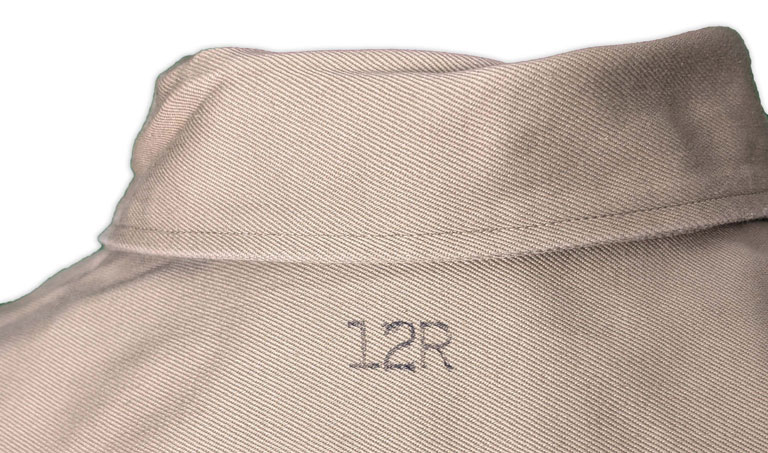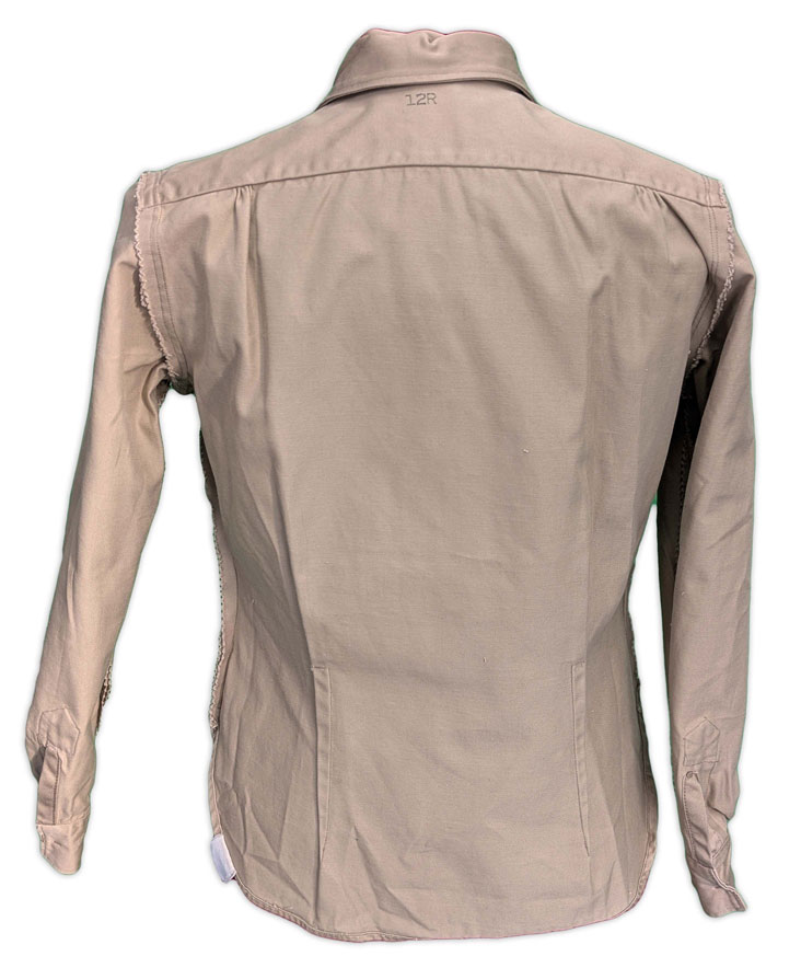 La chemise, réalisée en sergé de coton de six onces, était dotée d’un col convertible, ajustable au cou par une patte boutonnée, ainsi que d’une fermeture frontale à quatre petits boutons en plastique.