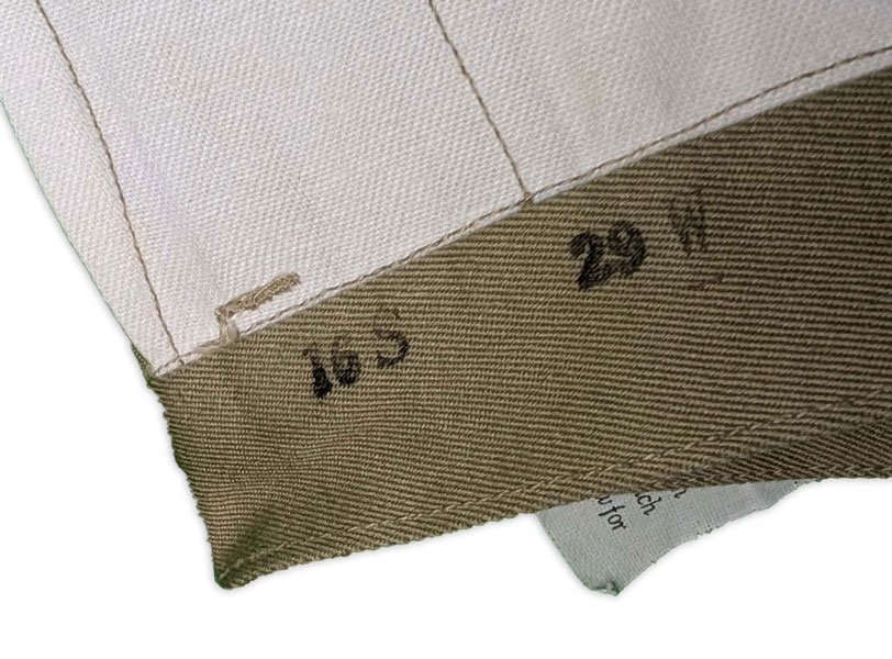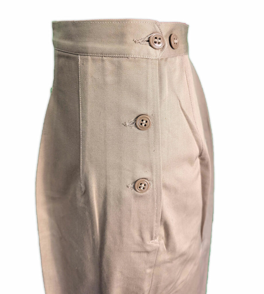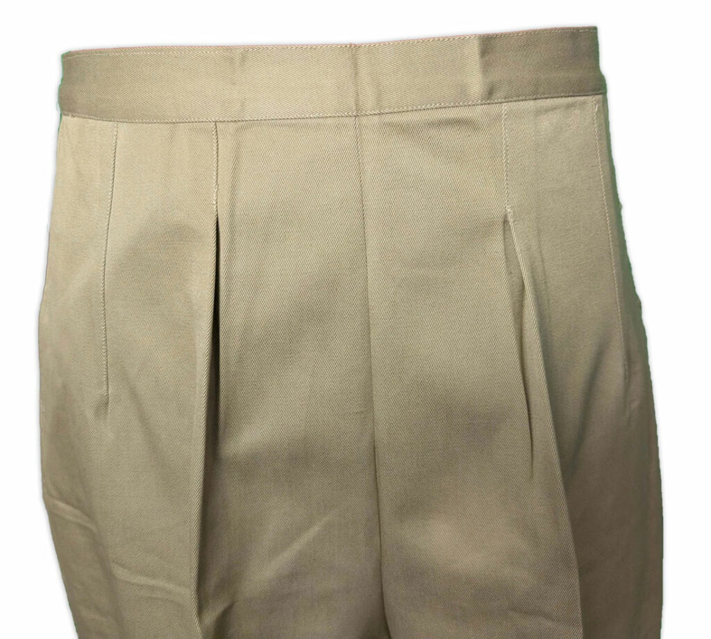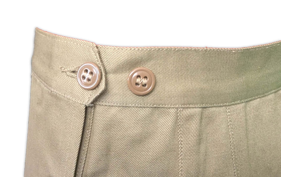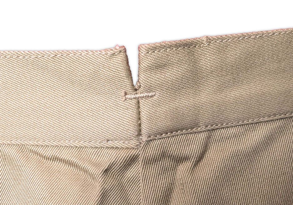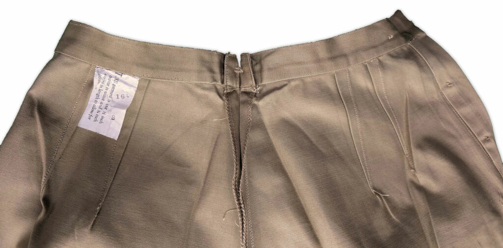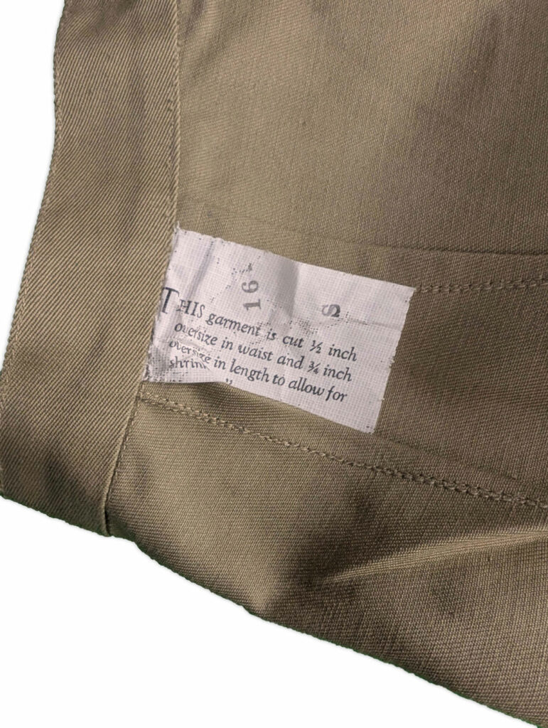 Le pantalon était confectionné en sergé de coton de 8,2 onces et comportait une fermeture à boutons avec ouverture à patte sur le côté gauche, ainsi qu’une poche dans la couture sur le côté droit.