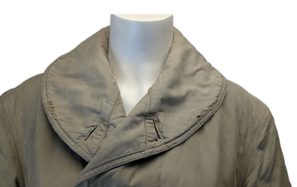 Adopté le 27 août 1942, le second modèle de Mackinaw reprend largement les caractéristiques de la version initiale. Il s’en distingue toutefois par l’abandon de la doublure en laine au niveau du col, désormais confectionné dans le même tissu que le reste du manteau.