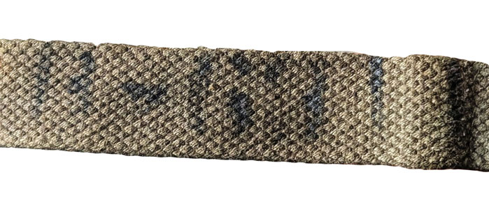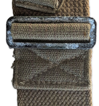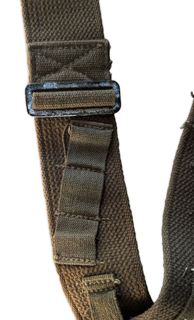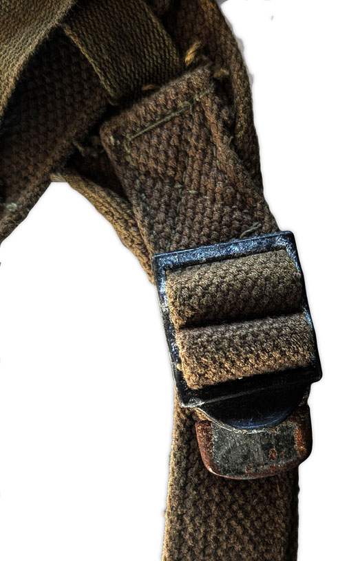 Sur la face interne d’une bretelle peut apparaître le laundry number du soldat auquel a appartenu ce brelage. Ce marquage reprend la première lettre de son prénom ainsi que les quatre derniers chiffres de son ASN (Army Serial Number).