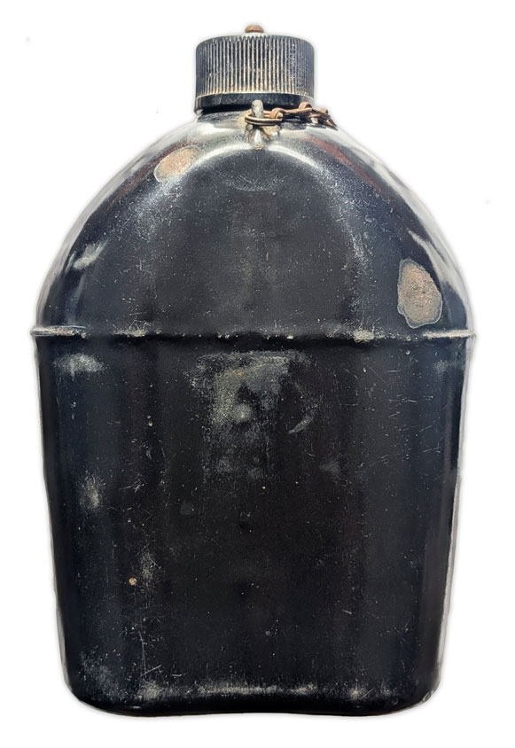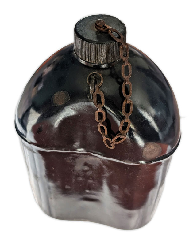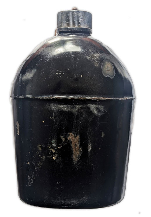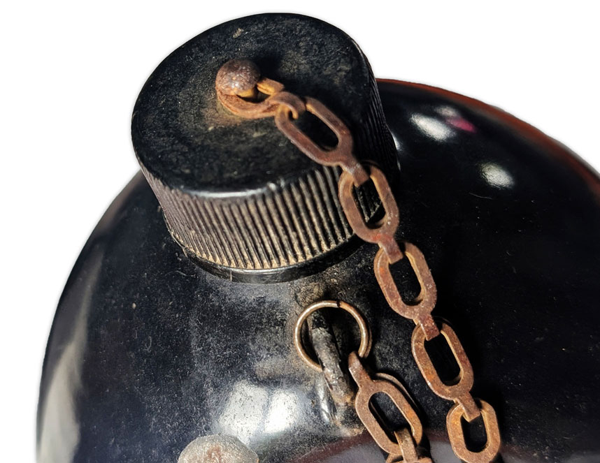 La gourde était accompagnée d’un quart métallique, lui aussi recouvert d’un émail noir et conçu pour s’insérer dans l’étui de transport. Ce dernier présentait des problèmes similaires d’écaillage.