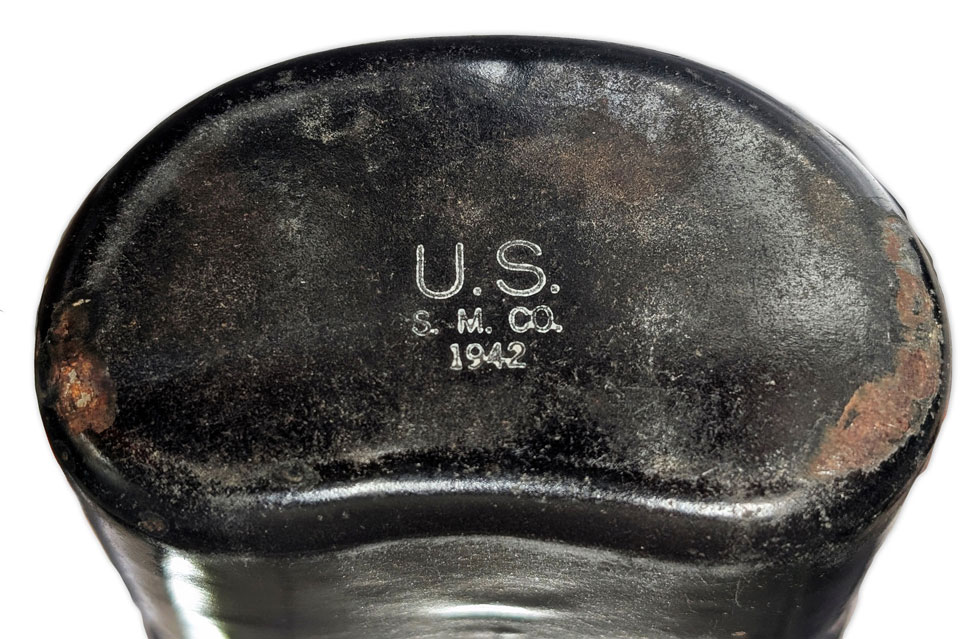 La gourde M-1942 se distingue par une soudure verticale similaire à celle de la M-1910, mais avec un bourrelet moins marqué grâce à l’emploi d’une technique de brasure. Il existe cependant des variantes présentant une soudure horizontale.